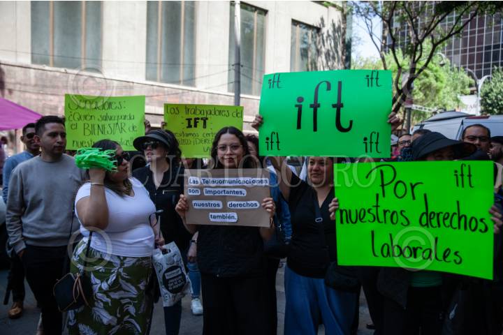 CIUDAD DE MÉXICO, 28ABRIL2025.- Ex trabajadores del Instituto Federal de Telecomunicaciones (IFT) protestan en las inmediaciones de la Cámara de senadores ante el avance de la reforma a la Ley de Telecomunicaciones y la incertidumbre de que no se respeten sus derechos laborales. FOTO: ANDREA MURCIA /CUARTOSCURO.COM