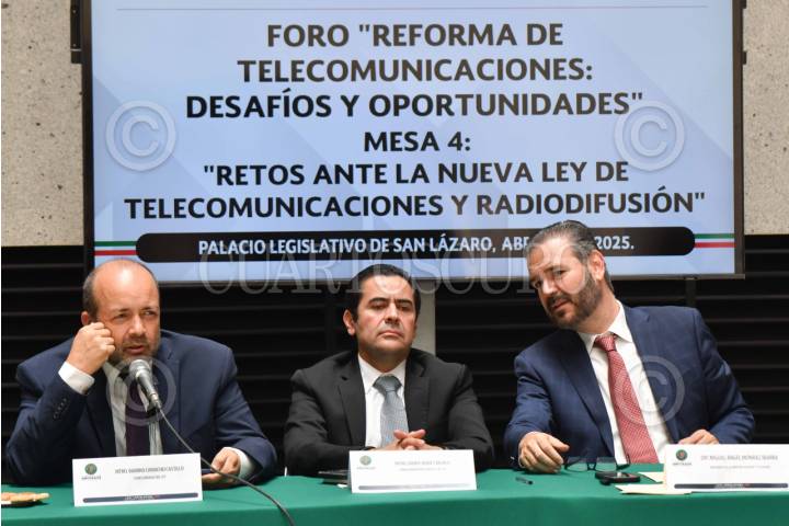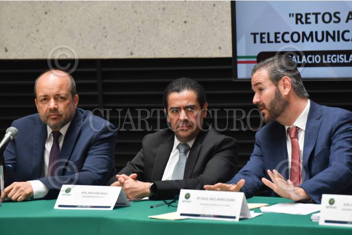 CIUDAD DE MÉXICO, 29ABRIL2025.- Miguel Ángel Monraz, diputado y presidente de la Comisión de Radio y Televisión, junto a Ramiro Camacho, comisionado del IFT, y Javier Juárez, comisionado presidente del IFT, durante el primer foro "Reforma de telecomunicaciones: desafíos y oportunidades" realizada en la Cámara de Diputados. FOTO: MARIO JASSO/CUARTOSCURO.COM