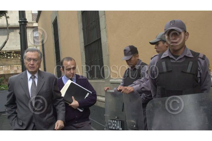 MEXDF 04AGOSTO2004.- El senador del PRI, Manuel Bartlett, llegó a la Camara de Senadores, en medio un dispositivo de seguridad, debido a las manifestaciones de los trabajadores del IMSS, que tratan de evitar la aprobación de las reformas a la ley de las pensiones. FOTO:Eunice Adorno/CUARTOSCURO.COM