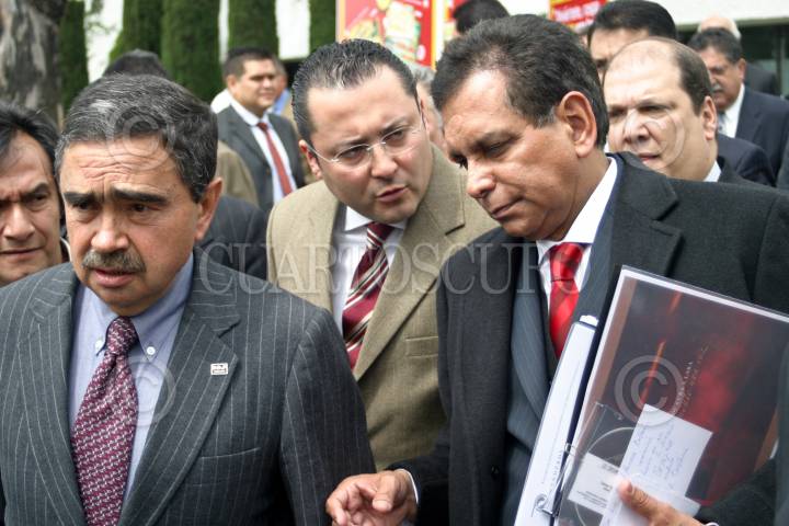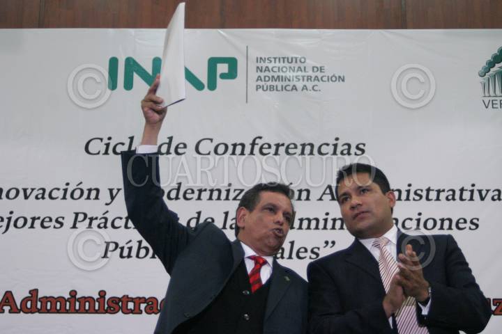 MÉXICO, D.F., 08MARZO2010.- Fidel Herrera Beltran, Gobernador del Estado de Veracruz y Ricardo Basurto Cortés, Secretario Ejecutivo del Instituto Nacional de Administración Pública (INAP), durante la conferencia "La Administración Pública en Veracruz". Esto, se realizó en las instalaciones del INAP. FOTO: MISAEL VALTIERRA/CUARTOSCURO.COM