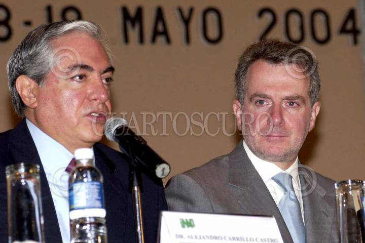 MEXDF 18MAYO2004.- Alejandro Carrillo director de INAP y el secretario de Gobernación Santiago Creel, durante el Foro de análisis de la administración pública, realizado en el Instituto Nacional Administración Publica. FOTO: Rosalba Villanueva/CUARTOSCURO.COM