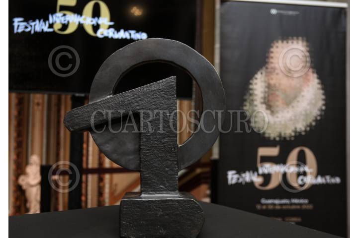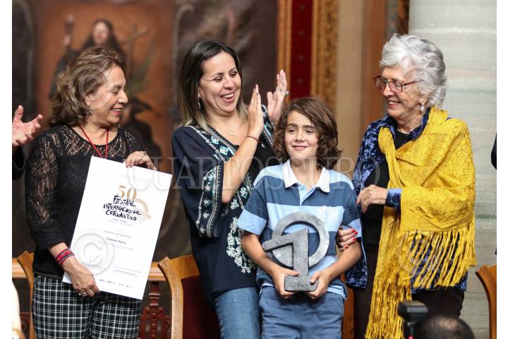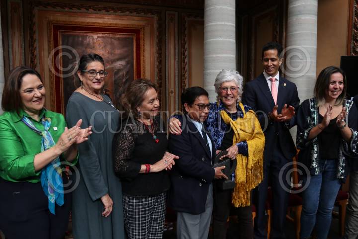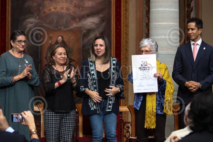Mariana Aymerich, directora general del Festival Internacional Cervantino; Cecilia Ramos Estrada, secretaria general de la universidad de Guanajuato; Lucina Jiménez López directora del INBA; Mariana Camarena de Obedo directora General del IEC Guanajuato; Rodrigo Martínez Nieto y Jorge Cabrejos Salame, director de mercadotecnia de la secretaría de turismo del Estado de Guanajuato durante la entrega de la presea Cervantino otorgada a Carmen Parra y que se llevó a cabo en el Teatro Juárez