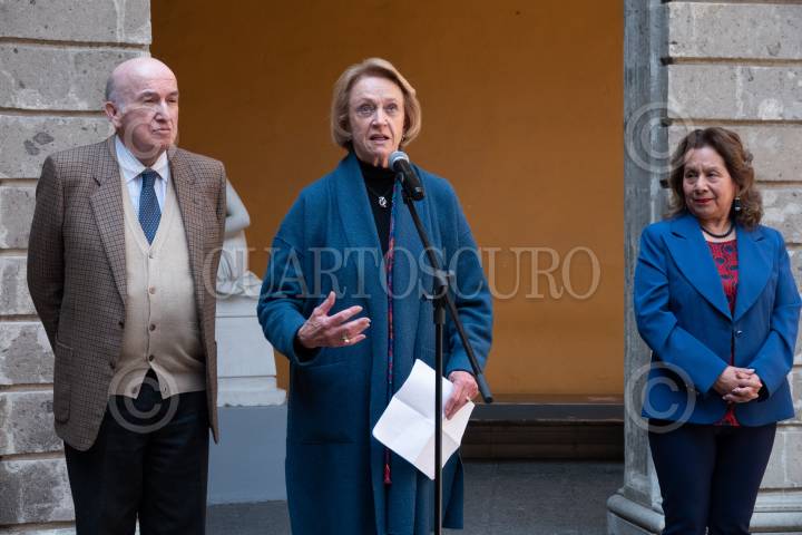 José Luis Martínez Hernández, Louis Noelle Gras y Lucina Jiménez López durante la inauguración “Manuel Felguérez: Una máquina estética” en el Museo Nacional de San Carlos.