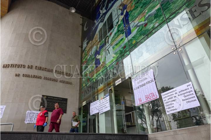 CIUDAD DE MÉXICO 20JUNIO2025.- Aspectos de la fachada del Instituto de Servicios Periciales y Ciencias Forenses, la cual se mantiene con pancartas en exigencia de mejoras laborales. FOTO:ROGELIO MORALES /CUARTOSCURO.COM