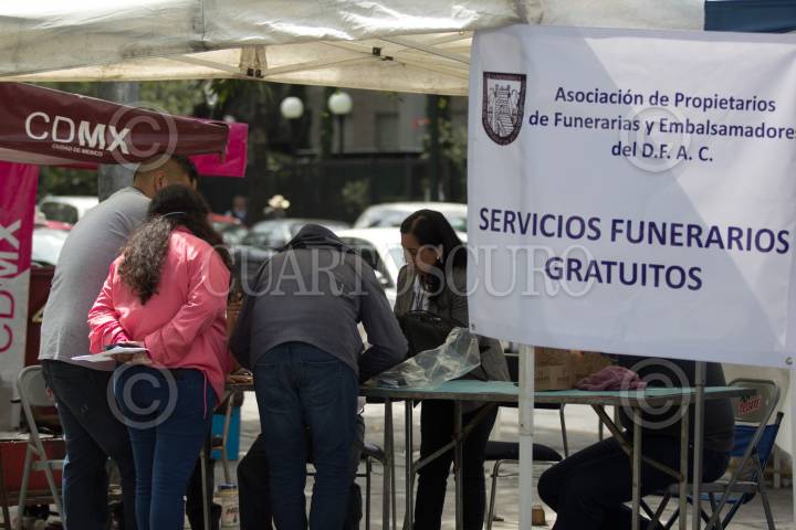 CIUDAD DE MÉXICO, 22SEPTIEMBRE2017.- Familiares y amigos de fallecidos en el terremoto del pasado martes acudieron al Instituto de Ciencias Forenses (Incifo) para realizar el reconocimiento de los cuerpos. En la imagen, servicios funerarios ofrecen la atención gratis a los afectados. FOTO: GALO CAÑAS /CUARTOSCURO.COM