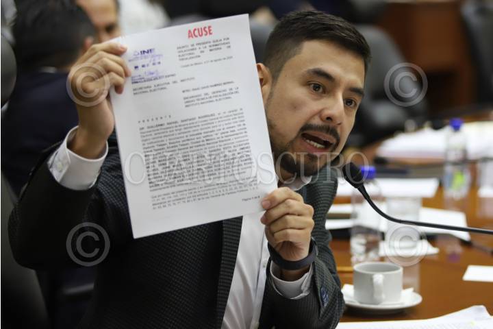 CIUDAD DE MÉXICO, 21AGOSTO2025.- El diputado de Morena y representante del partido en el Instituto Nacional Electoral (INE) Guillermo Santiago Rodríguez, mostró imágenes con noticias que acusan al líder del PRI de enriquecimiento ilícito y pidió que sea auditado. FOTO: DANIEL AUGUSTO/ CUARTOSCURO.COM