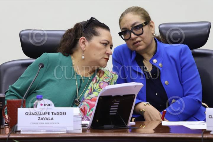 CIUDAD DE MÉXICO, 21AGOSTO2025.- La consejera presidenta del INE, Guadalupe Taddei y la secretaria ejecutiva, Claudia Arlette Espino, dialogan durante la sesión extraordinaria de este jueves. FOTO: DANIEL AUGUSTO/ CUARTOSCURO.COM