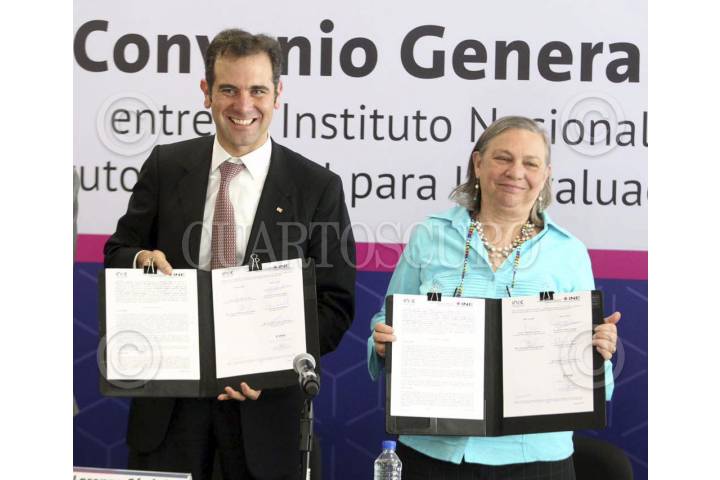 CIUDAD DE MÉXICO, 31MARZO2017.- Lorenzo Cordova Vianello y Sylvia Schmelkes del Valle durante la firma de convenio del Instituto Nacional para la Evaluación de la Educación (INEE) y el Instituto Nacional Electoral (INE) que permitirá generar, difundir, intercambiar y promocionar el uso de información y conocimiento sobre el estado de la educación cívica y la formación ciudadana en el Sistema Educativo Nacional. FOTO: INE /CUARTOSCURO.COM