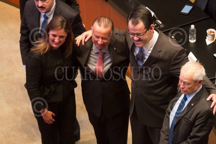 CIUDAD DE MÉXICO, 25ABRIL2018.- Patricia Gabriela Vázquez del Mercado Herrera y Bernardo Hugo Naranjo Piñera tomaron protesta como nuevos consejeros del Instituto Nacional para la Evaluación de la Educación (INEE), ante el pleno del Senado de la República. En la imagen los acompaña el senador Daniel Amador Gaxiola. FOTO: MOISÉS PABLO /CUARTOSCURO.COM