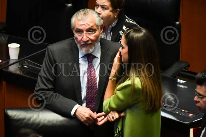 CIUDAD DE MÉXICO, 26JUNIO2025.- Adán Augusto López, senador y coordinador de Morena, junto a su compañera de bancada Andrea Chávez, durante la sesión extraordinaria del Senado de la República en la que se aprobó la minuta por la que el Instituto Nacional de Estadística, Geografía e Informática (Inegi) asumirá las funciones del Consejo Nacional de Evaluación de la Política de Desarrollo Social (Coneval). FOTO: MARIO JASSO/CUARTOSCURO.COM