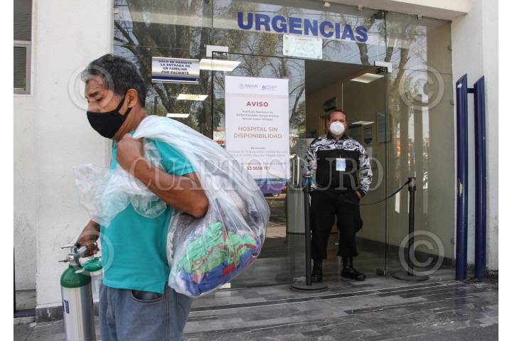 Hombre con ropa en bolsa y tanque de oxígeno en mano a las afueras del área de urgencias del INER.