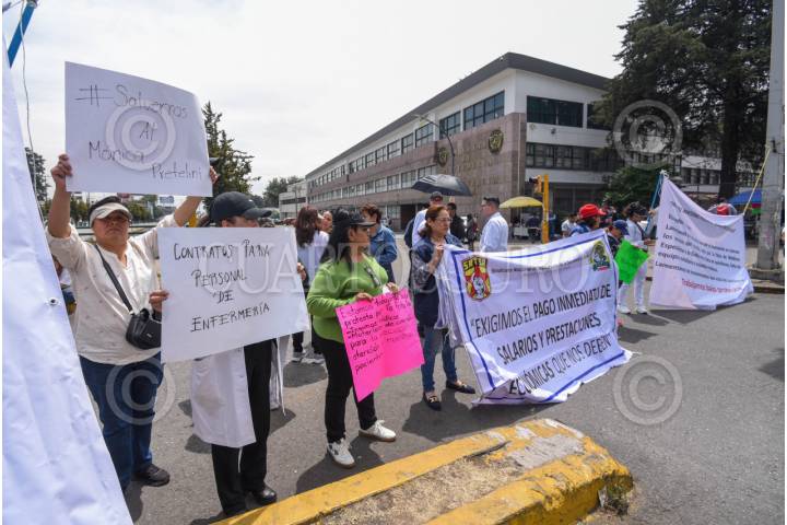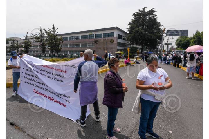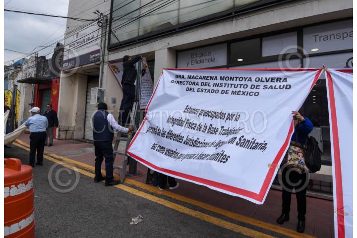 TOLUCA, ESTADO DE MÉXICO, 16JULIO2025.- Trabajadores del sector salud adscritos a la Jurisdicción Sanitaria número 2 de Toluca reunidos a temprana hora y con mantas se fueron a paro laboral, son al menos 85 clínicas de cuatro municipios las que dejarán de dar servicio ante el incumplimiento en la transición IMSS-Bienestar, demandan el pago de bonos atrasados, falta de medicamentos, insumos y material de curación, entre otros. FOTO: CRISANTA ESPINOSA AGUILAR /CUARTOSCURO.COM