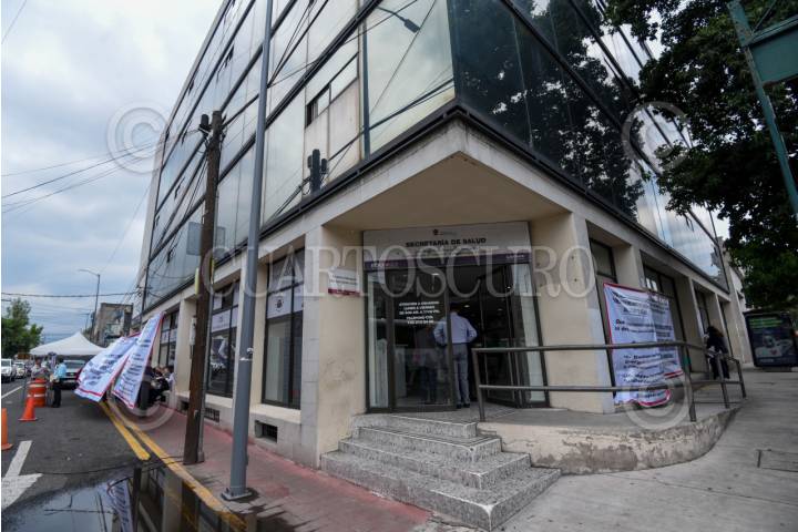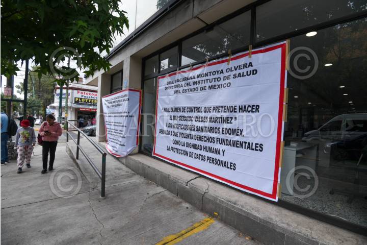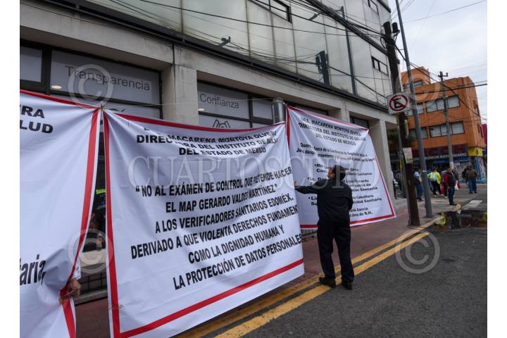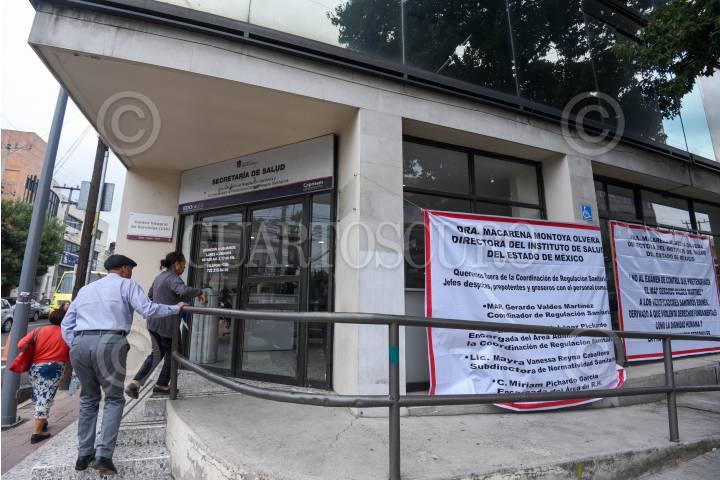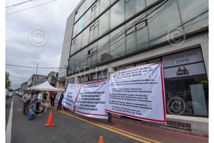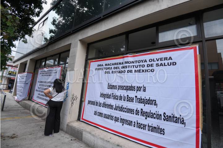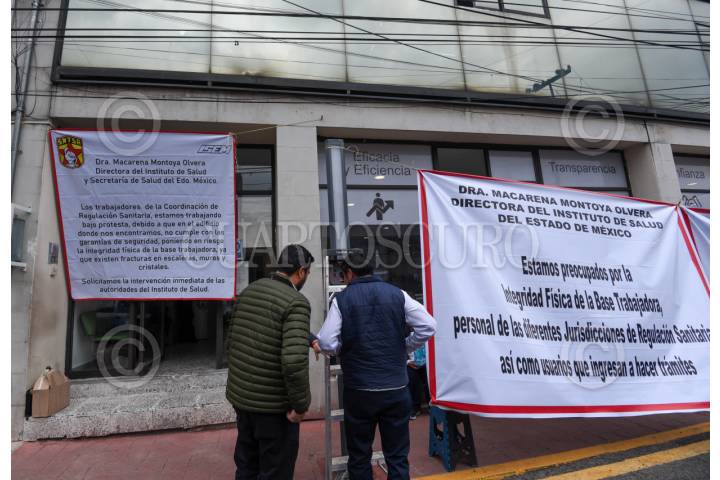TOLUCA, ESTADO DE MÉXICO, 06AGOSTO2025.- Algunos trabajadores de la Coordinación de Regulación Sanitaria y Comisión para la Protección Contra Riesgos Sanitarios de la Secretaría de Salud colocaron mantas en las inmediaciones del edificio en el que laboraban, ubicado en la avenida Morelos esquina Calle Josefa Ortiz de Domínguez en la ciudad de Toluca, trabajan bajo protesta y se encuentran preocupados por su integridad física debido que el edificio que ocupan no cumple con las garantías de seguridad, existen gritas en paredes, escaleras y vidrios, poniendo en riesgo a trabajadores y usuarios, piden a las autoridades del ISEM tomen cartas en el asunto, ya que a pesar de varias denuncias no les han echo caso. FOTO: CRISANTA ESPINOSA AGUILAR/CUARTOSCURO.COM