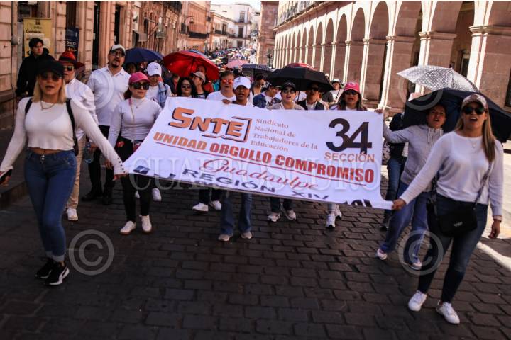 ZACATECAS, ZACATECAS, 19MARZO2025.- Maestros de la Coordinadora Nacional de Trabajadores de la Educación y del Sindicato Nacional de Trabajadores de la Educación sección 34 (regiones Guadalupe-Zacatecas), marcharon por las principales calles de la ciudad hasta llegar al Congreso del Estado, como parte del Paro Nacional y acciones de lucho en contra de la abrogación de la Ley del ISSSTE. FOTO: ADOLFO VLADIMIR /CUARTOSCURO.COM