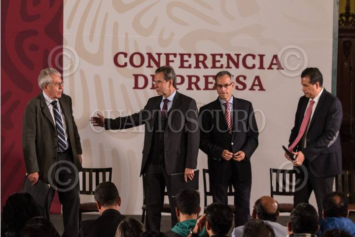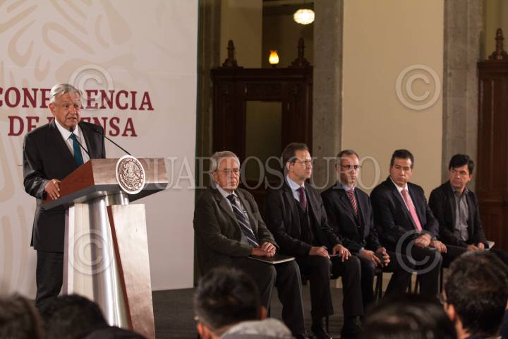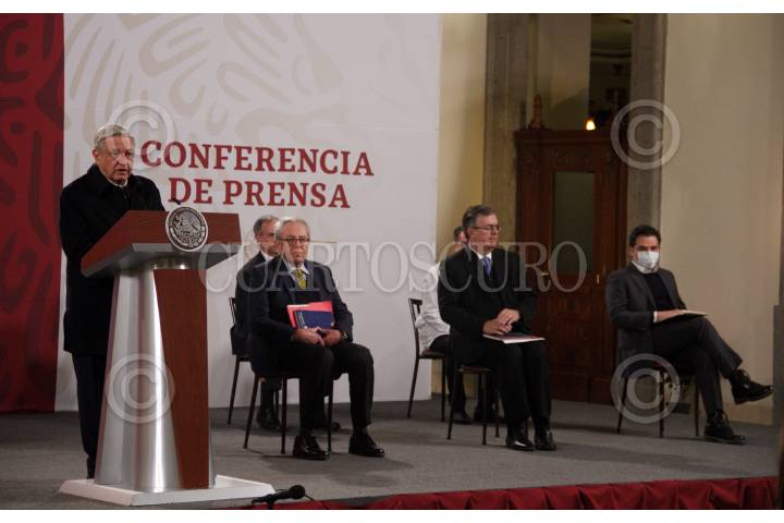 Andrés Manuel López Obrador, presidente de México acompañado de Jroge Alcocer Varela, secretario de Salud; Marcelo Ebrard Casaubon, secretario de Relaciones Exteriores; Zoé Robledo Aburto, director general del IMSS; Hugo López-Gatell Ramírez, subsecretario de Prevención y Promoción de la Salud y Ramiro López Elizalde, director normativo de Salud del Issste, durante la conferencia matutina en Palacio Nacional con enfoque al tema de la salud.