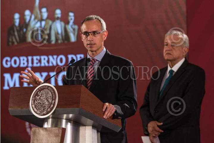 CIUDAD DE MÉXICO, 05JULIO2019.- Jorge Alcocer Villanueva, secretario de Salud; Ricardo Mejia Subsecretario de Seguridad Pública, Esteban Moctezuma, secretario de Educación y Jesús Ramirez, director de comunicación social de Presidencia, durante la presentación del programa para jóvenes y niños de prevención de Salud y consumo de drogas en la conferencia matutina en el Palacio Nacional. FOTO: ANDREA MURCIA /CUARTOSCURO.COM