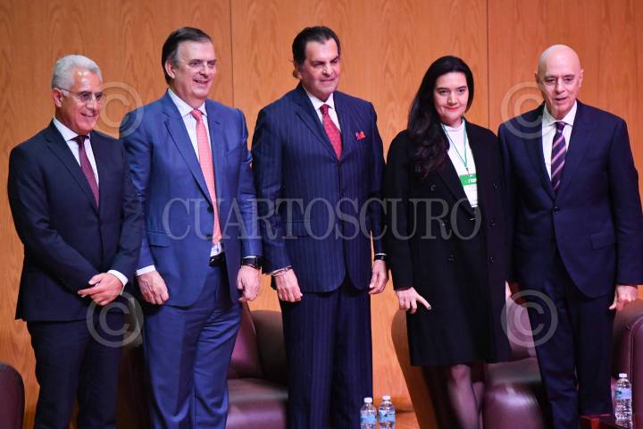 CIUDAD DE MÉXICO, 10ENERO2025.- Marcelo Ebrard, secretario de Economía, durante su participación en el "Seminario de perspectivas económicas 2025" realizado en las instalaciones del Instituto Tecnológico Autónomo de México (ITAM) en la alcaldía Álvaro Obregón. Lo acompañan: Julia González, Asociación de Ex Alumnos del ITAM, y Arturo Fernández, rector del ITAM. FOTO: MARIO JASSO /CUARTOSCURO.COM