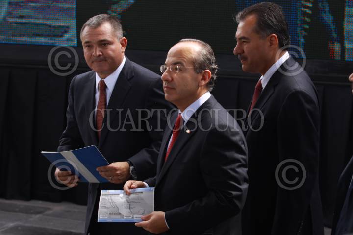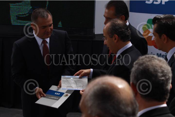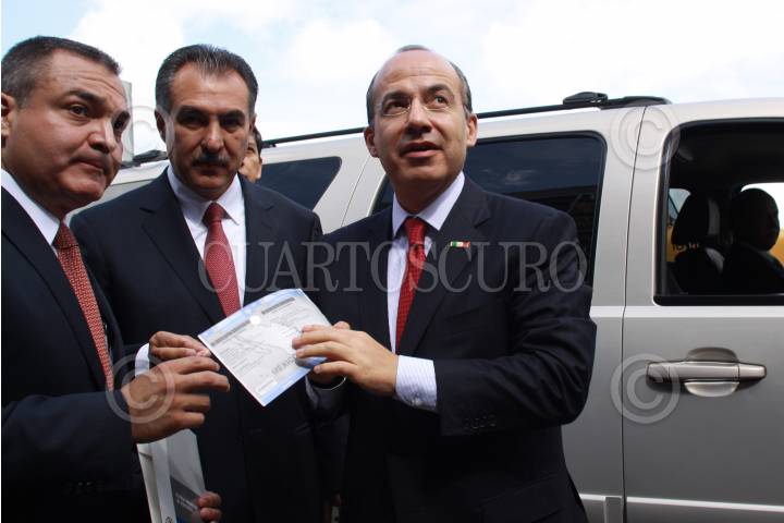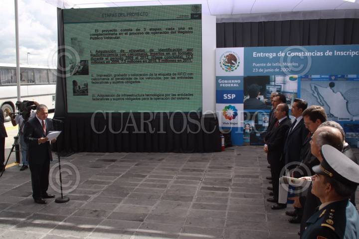 MUNICIPIO PUENTE DE IXTLA, MORELOS 23JUNIO2009.- Felipe Calderon Hinojosa presidente de México acompañado por Genaro García Luna, titular de Seguridad Pública y Marco Antonio Adame Gobernador de Morelos donde como parte de la gira de trabajo por el Estado de Morelos el mandatario mexicano realizó la entrega de Constancias de Inscripción al Registro Público Vehicular FOTO: SÁSHENKA GUTIÉRREZ/CUARTOSCURO.COM