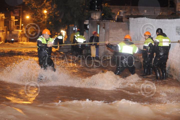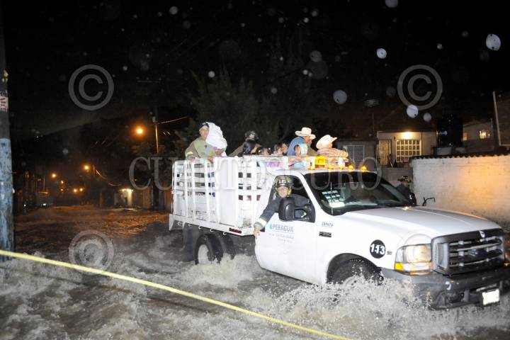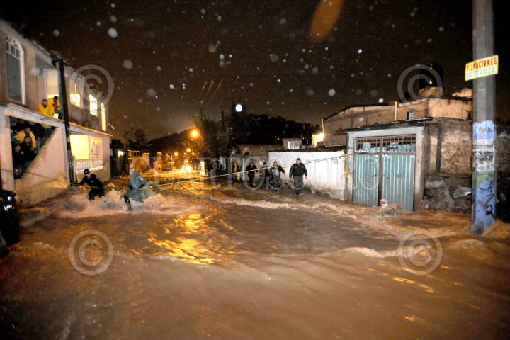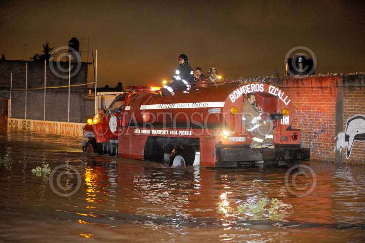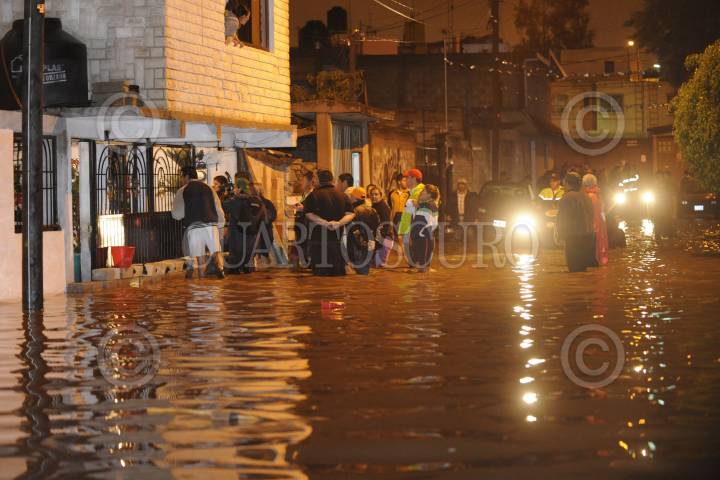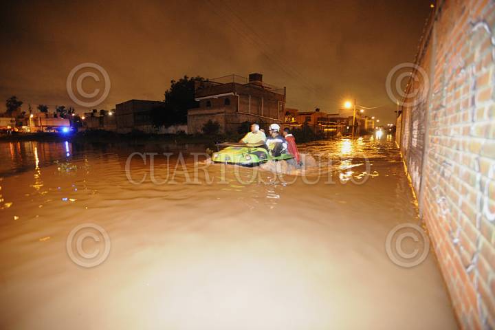 CUAUTITLÁN IZCALLI, ESTADO DE MÉXICO, 31AGOSTO2011.- Cinco colonias resultaron afectadas por las fuertes lluvias que provocaron inundaciones de más de un metro de agua. Las precipitaciones provocaron que se desbordara la presa El Ángulo en el municipio de Cuautitlan Izcalli. Cientos de cuadrillas de bomberos, policía estatal y protección civil se dieron a la tarea de rescatar con camionetas y motos anfibio, algunas de las familias que quedaron atrapadas en sus domicilios ya que la fuerte corriente de agua en las calles amenazaba su integridad física. Los municipios Villa Nicolás Romero y Atizapan también fueron afectadas la tromba. FOTO: LUIS CARBAYO/CUARTOSCURO.COM