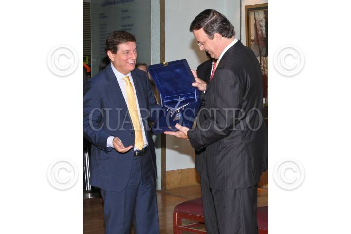 MÉXICO, D.F., 06SEPTIEMBRE2010.- Marcelo Ebrard Casaubón, Jefe de Gobierno del Distrito Federal, recibió un obsequio por parte del director general de Iberia, Manuel Antonio López Aguilar, antes de realizar el bautizo del nuevo avión Airbus A340-600 de la aerolínea Iberia el cual porta el nombre de "Ciudad de México" y realizará viajes España-México-España. Esto se realizó hoy 6 de septiembre de 2010 en el Aeropuerto Internacional Benito Juárez de la Ciudad de México. Lo acompañan Héctor Velázquez, director general del Aeropuerto Internacional de la Ciudad de México y el Embajador de España en México, Manuel Alabart. FOTO: MISAEL VALTIERRA/CUARTOSCURO.COM