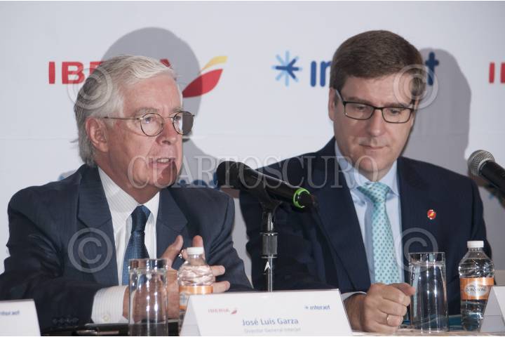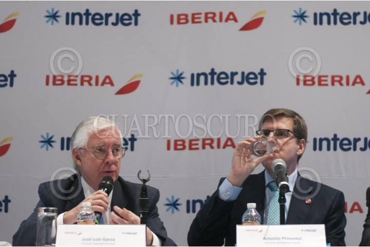 MÉXICO, D.F., 25JUNIO2014.- José Luis Garza, director general de Interjet, y Antonio Pimentel, director de Alianzas Iberia, durante la firma de colaboración entre estas dos aerolíneas que favorecerá la conectividad aérea entre el continente europeo y los principales destinos turísticos y de negocios del país. FOTO: DIEGO SIMÓN SÁNCHEZ /CUARTOSCURO.COM