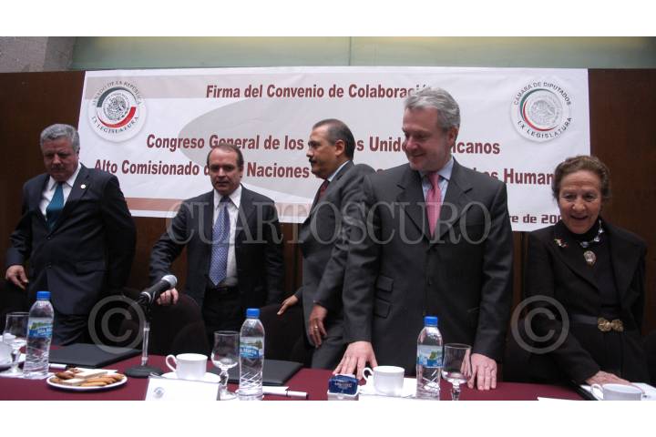 MÉXICO D.F. 12DICIEMBRE2006.- El diputado Jorge Zermeño, Amerigo Icalcaterra representante del alto comisionado de la ONU y los Manlio Flavio Beltrone, Santiago Creel Miranda y Rosario Ibarra de Piedra, durante lafirma del convenio de cooperación con la comisión de derechos humanos del senado. FOTO: GUILLERMO PEREA /CUARTOSCURO.COM