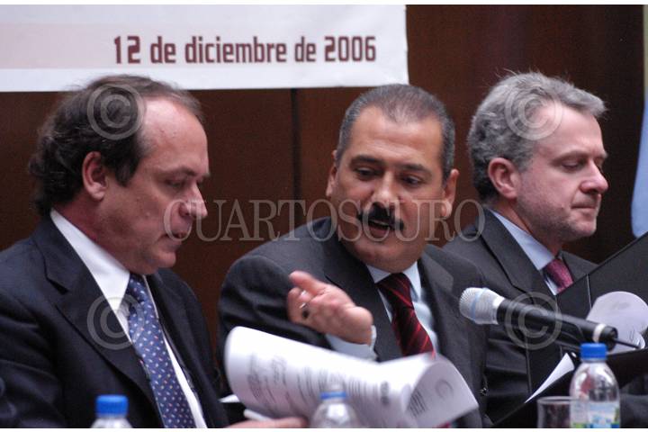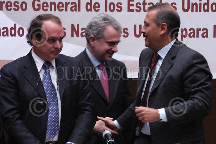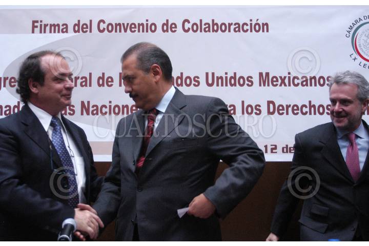 MÉXICO D.F. 12DICIEMBRE2006.- Amerigo Icalcaterra representante del alto comisionado de la ONU y el senador Manlio Flavio Beltrones y el senador Santiago Creel Miranda durante la firma del convenio de cooperación con la comisión de derechos humanos del senado. FOTO: GUILLERMO PEREA /CUARTOSCURO.COM