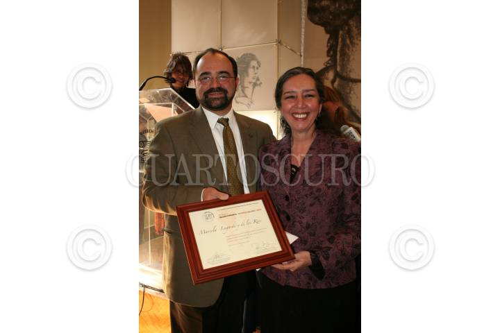 MÉXICO, D.F. 24NOVIEMBRE2006.- La CNDHDF entregó el premio Hermilia Galindo. En la imagen, Emilio Álvarez Icasa galardonando a Marcela Lagarde y de Los Ríos, implementadora del tèrmino "feminicidio" en la constitución polìtica. FOTO: PAOLA HIDALGO/CUARTOSCURO.COM