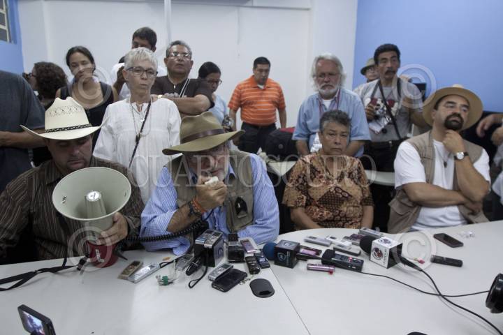 COATZACOALCOS, VERACRUZ, 18SEPTIEMBRE2011.- El poeta Javier Sicilia acompañado de Julian LeBaron, Tere Carmona y de Emilio Alvarez Icaza, integrantes del Movimiento por la Paz con Justicia y Dignidad ofreció esta mañana una conferencia de prensa acerca de los acontecimientos regisrados anoche en el kilometro 86 autopista Villahermosa - Coatzacoalcos en donde recibieron una alerta para aplicar un protocolo de seguridad como medida de protección ante una posible emboscada. FOTO: RODOLFO ANGULO/CUARTOSCURO.COM