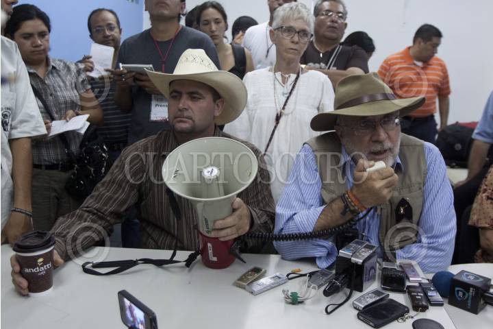 COATZACOALCOS, VERACRUZ, 18SEPTIEMBRE2011.- El poeta Javier Sicilia acompañado de Julian LeBaron, durante una conferencia de prensa que ofrecieron esta mañana acerca de los acontecimientos regisrados anoche en el kilometro 86 autopista Villahermosa - Coatzacoalcos en donde recibieron una alerta para aplicar un protocolo de seguridad como medida de protección ante una posible emboscada. FOTO: RODOLFO ANGULO/CUARTOSCURO.COM