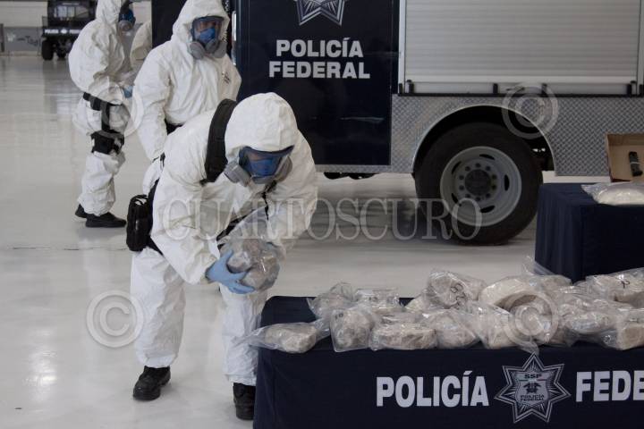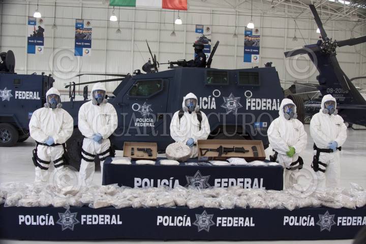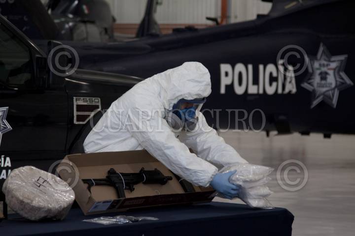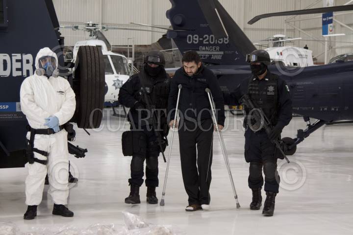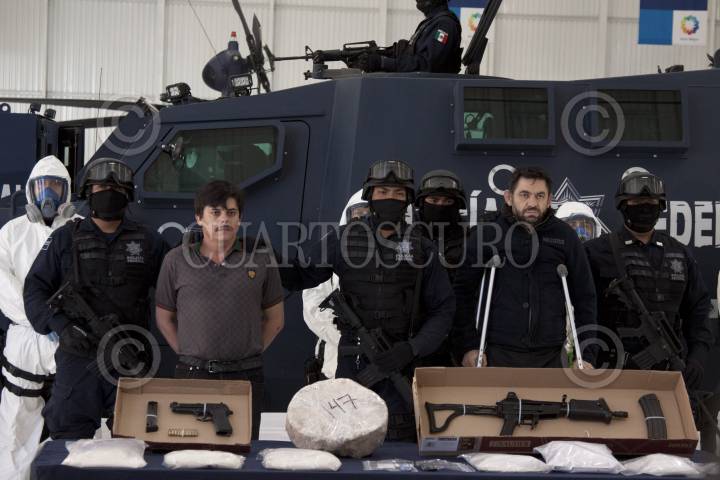 MÉXICO, D.F., 14FEBRERO2012.- La Secretaría de Seguridad Pública Federal detuvo en Culiacán, Sinaloa, a Jaime Herrera, alias "el JH" o "el viejito", identificado como uno de los principales productores y distribuidores de drogas sintéticas al servicio del "cártel del Pacífico" encabezado por Joaquín Guzmán Loera, alias "el Chapo", y por Ismael Mario Zambada, alías "el Mayo Zambada". Herrera es prófugo de la justicia en Estados Unidos, donde cuenta con antecedentes de actividades delictivas en diversos estados. En este operativo también se detuvo a Felipe Naranjo Sevilla, originario de Culiacán, de 51 años de edad, presunto responsable de pagar los insumos químicos y la nómina de las personas que producían la metanfetamina (ICE). En el operativo fueron asegurados una arma larga, una corta, dos vehículos, tres paquetes de un peso aproximado de un kilo cada uno que contenían material con características del ICE y 147 paquetes más con un peso aproximado de 202 kilogramos, cuya sustancia responde a las características de la metanfetamina. FOTO: MOISÉS PABLO/CUARTOSCURO.COM