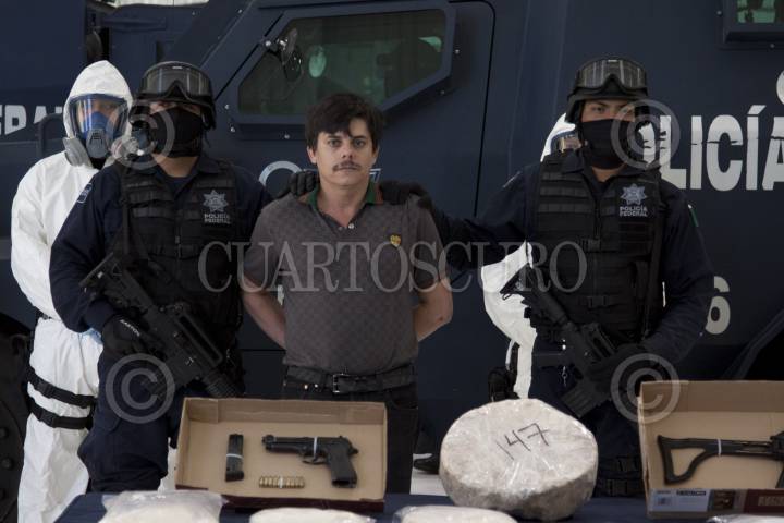 MÉXICO, D.F., 14FEBRERO2012.- La Secretaría de Seguridad Pública Federal detuvo en Culiacán, Sinaloa, a Jaime Herrera, alias "el JH" o "el viejito", identificado como uno de los principales productores y distribuidores de drogas sintéticas al servicio del "cártel del Pacífico" encabezado por Joaquín Guzmán Loera, alias "el Chapo", y por Israel Zambada, alías "el Mayo Zambada". Herrera es prófugo de la justicia en Estados Unidos, donde cuenta con antecedentes de actividades delictivas en diversos estados. En este operativo también se detuvo a Felipe Naranjo Sevilla, originario de Culiacán, de 51 años de edad, presunto responsable de pagar los insumos químicos y la nómina de las personas que producían la metanfetamina (ICE). En el operativo fueron asegurados una arma larga, una corta, dos vehículos, tres paquetes de un peso aproximado de un kilo cada uno que contenían material con características del ICE y 147 paquetes más con un peso aproximado de 202 kilogramos, cuya sustancia responde a las características de la metanfetamina. FOTO: MOISÉS PABLO/CUARTOSCURO.COM