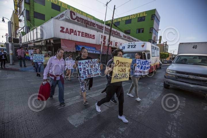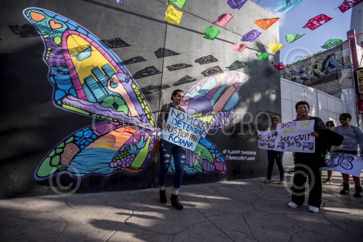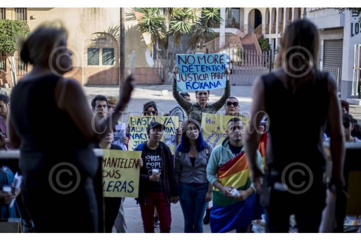 TIJUANA BAJA CALIFORNIA, 06JUNIO2018.- Medio centenar de activistas de la comunidad LGBTIQ en apoyo a los migrantes, se manifestaron esta tarde por la muerte de Roxana Hernández, mujer transgénero que falleciera al estar bajo la custodia del servicio Estadounidense de Inmigración y Aduanas (ICE, por sus siglas en ingles). Roxana Hernández, de 33 años de edad, formó parte de la Caravana Migrante que partió el pasado 25 de marzo en la frontera sur de México y que arribó el pasado abril al cruce fronterizo de El Chaparral, con la intención de pedir asilo político en Estados Unidos. FOTO: OMAR MARTÍNEZ /CUARTOSCURO.COM
