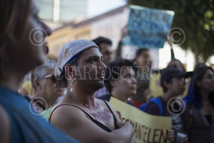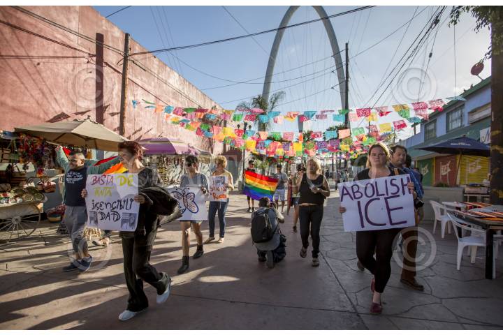 TIJUANA BAJA CALIFORNIA, 05JUNIO2018.- Medio centenar de activistas de la comunidad LGBTIQ en apoyo a los migrantes, se manifestaron esta tarde por la muerte de Roxana Hernández, mujer transgénero que falleciera al estar bajo la custodia del servicio Estadounidense de Inmigración y Aduanas (ICE, por sus siglas en ingles). Roxana Hernández, de 33 años de edad, formó parte de la Caravana Migrante que partió el pasado 25 de marzo en la frontera sur de México y que arribó el pasado abril al cruce fronterizo de El Chaparral, con la intención de pedir asilo político en Estados Unidos. FOTO: OMAR MARTÍNEZ /CUARTOSCURO.COM
