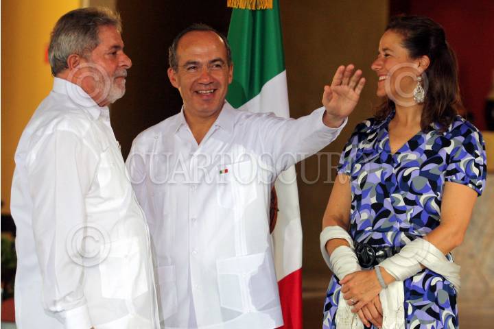 RIVERA MAYA, QUINTANA ROO, 21FEBRERO2010.- Luis Ignácio Lula da Silva, Presidente de Brasil, saluda y bromea con Felipe Calderón, Presidente de México y su esposa Margarita Zavala minutos antes de realizarse la ceremonia de inauguración de la XXI Cumbre de Río que se lleva a cabo en esta zona turística. FOTO: AMARANTA PRIETO/CUARTOSCURO.COM