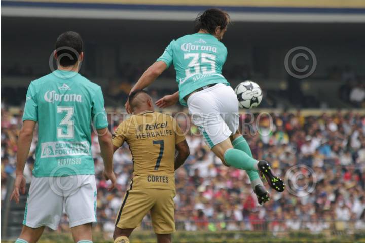 CIUDAD DE MÉXICO, 31JULIO2016.- El defensa del León, Ignacio González, despeja el balón de manera poco ortodoxa del área chica en el encuentro en contra de los Pumas de la UNAM, partido correspondiente a la jornada 3 y llevado a cabo en el Estadio Olímpico. FOTO: MOISÉS PABLO /CUARTOSCURO.COM