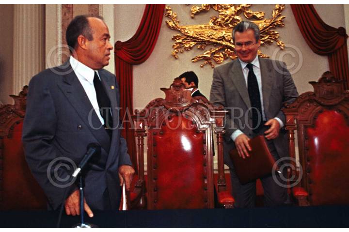 Ignacio Carrillo Prieto, Fiscal Especial Para Movimientos Politícos y Sociales del Pasado y Baltazar Garzon, juez de la Audiencia Nacional de España, al inicio de la conferencia, donde se trataron temas sobre la guerra sucia en diferentes paises Latinoamericanos, en el Palacio de Mineria. FOTO: Eunice Adorno/CUARTOSCURO.COM