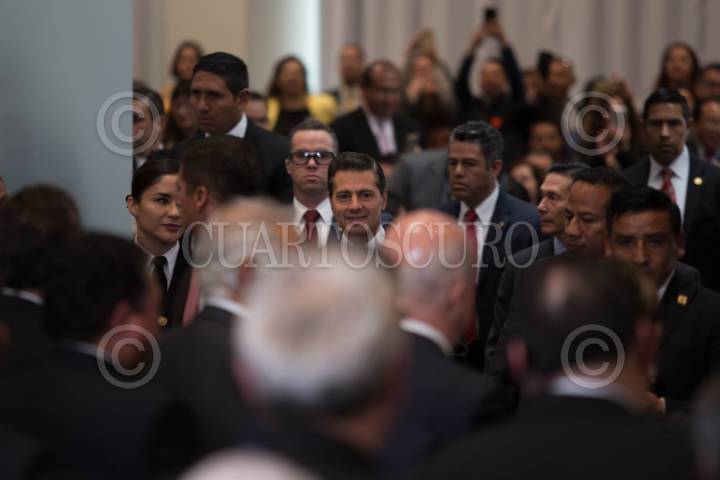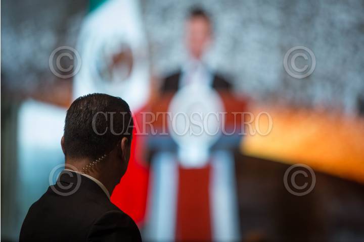 CIUDAD DE MÉXICO, 13NOVIEMBRE2018.- El presidente de la República Mexicana, Enrique Peña Nieto encabezó la presentación de los resultados del sector de economía y generación de empleos en su sexenio, inaugurando también la nueva Torre Ejecutiva de la Secretaría de Economía, fue acompañado por el secretario de economía Ildefonso Guajardo Villarreal y el secretario de Trabajo y Prevención Social Roberto Rafael Campa Ciprián. En la imagen un elemento del Estado Mayor Presidencial observa el discurso del ejecutivo, este órgano técnico militar está próximo a desaparecer pues el próximo presidente no lo requerirá. FOTO: ILSE HUESCA /CUARTOSCURO.COM