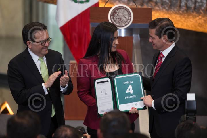 CIUDAD DE MÉXICO, 13NOVIEMBRE2018.- El presidente de la República Mexicana, Enrique Peña Nieto encabezó la presentación de los resultados del sector de economía y generación de empleos en su sexenio, inaugurando también la nueva Torre Ejecutiva de la Secretaría de Economía, en la imagen el ejecutivo entrega el acta de filiación a la empleada 4 millones María Fernanda Hernández Olmos junto al secretario de economía Ildefonso Guajardo Villarreal. FOTO: ILSE HUESCA /CUARTOSCURO.COM