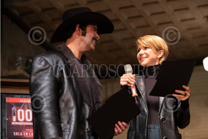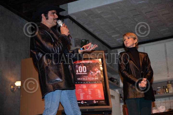 Pablo Montero e Iliana Fox durante la develación de placa por las primeras 100 representaciones de la puesta en escena "Sola en la oscuridad", que se presenta en el Teatro México del Centro Teatral Manolo Fábregas.