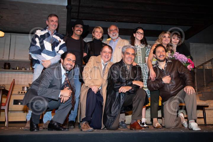 Parte del elenco y padrinos durante la develación de placa por las primeras 100 representaciones de la puesta en escena "Sola en la oscuridad", que se presenta en el Teatro México del Centro Teatral Manolo Fábregas.