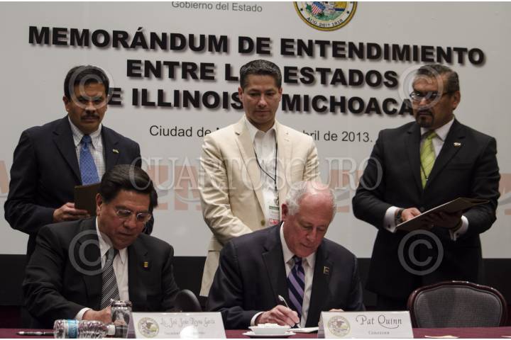MÉXICO, D.F., 05ABRIL2013.- José Jesús Reyna García, Secretario de Gobierno del estado de Michoacán (en representación de Fausto Vallejo) y Pat Quinn, Gobernador del estado de Illinois, Estados Unidos; firmaron un memorándum de entendimiento entre los estados de Illinois y Michoacán. Ésto se llevó acabo en un conocido hotel de la zona de Polanco. FOTO: MISAEL VALTIERRA / CUARTOSCURO.COM