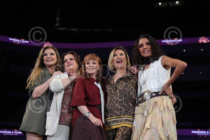 CIUDAD DE MÉXICO, 11JUNIO2025. Isabel Lascurain, Mimí, Mayte Lascurain, Ilse y Fernanda Meade durante una conferencia de prensa donde se presentaron las nuevas fechas para el espectáculo “Pandora & Flans + Inesperado Tour”, en la Arena Ciudad de México. FOTO: EDGAR NEGRETE LIRA/CUARTOSCURO.COM