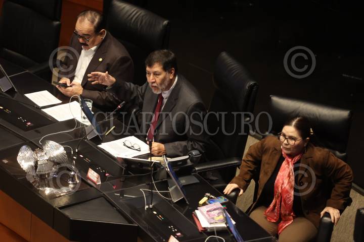 CIUDAD DE MÉXICO, 30ENERO2025.- Continúa el procedimiento de insaculación pública de las personas elegibles aprobadas por el Comité de Evaluación del Poder Judicial de la Federación para las elecciones de magistraturas y ministros, llevada a cabo por parte de la mesa directiva del Senado de la República. En la imagen, Adán Augusto López, senador y coordinador del grupo parlamentario de Morena, junto a Gerardo Fernández Noroña, presidente de la mesa directiva, e Imelda Castro, vicepresidenta de la mesa directiva. FOTO: MARIO JASSO/CUARTOSCURO.COM