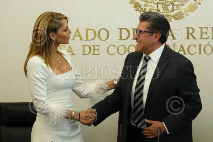 Inés Sainz Gallo, presentadora de TV, periodista y modelo, y Ricardo Monreal, coordinador de la JUCOPO, se saludaron durante su presentación en la sala de la Junta de Coordinación Política en el Senado de la República