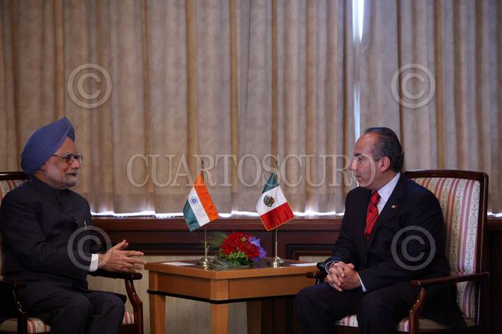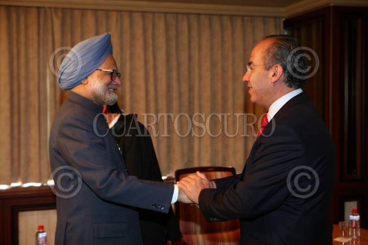 SAPPORO, JAPON., 07JULIO2008. -El Presidente de la Republica, Felipe Calderon Hinojosa durante la reunión Bilateral con Manmhan Sing, primer ministro de la India. FOTO ALFREDO GUERRERO/CUARTOSCURO.COM