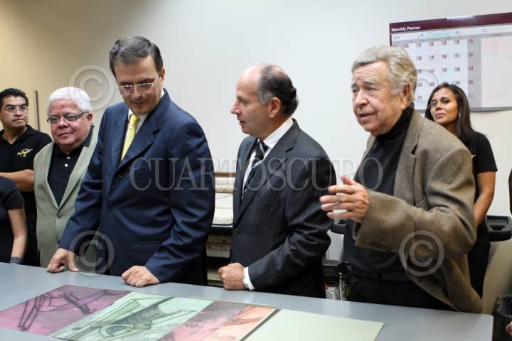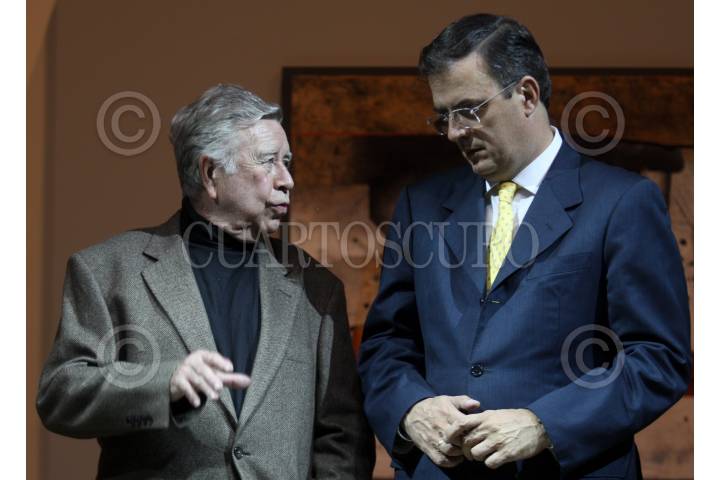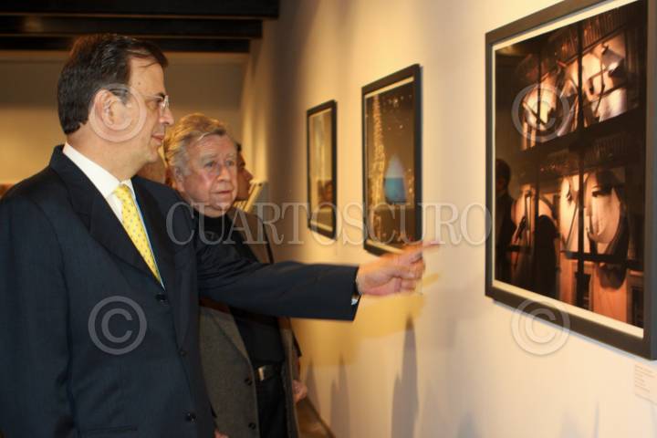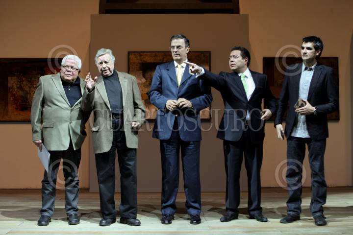 MÉXICO, D.F., 24JUNIO2010.- El artista plástico zacatecano Manuel Felguérez y Marcelo Ebrard, jefe de gobierno capitalino durante la inauguración de la exposición "Manuel Felguérez, Ciudad en Movimiento" que se realizo en el Centro Cultural Estación Indianilla. FOTO: RODOLFO ANGULO/CUARTOSCURO.COM