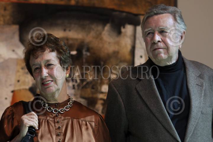 MÉXICO, D.F., 24JUNIO2010.- El artista plástico zacatecano Manuel Felguérez acompañado de su esposa Mercedes Oteyza durante la inauguración de la exposición "Manuel Felguérez, Ciudad en Movimiento" que se realizo en el Centro Cultural Estación Indianilla. FOTO: RODOLFO ANGULO/CUARTOSCURO.COM