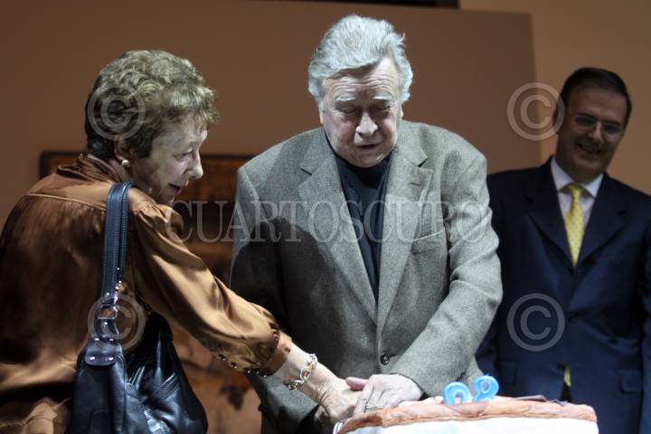 MÉXICO, D.F., 24JUNIO2010.- El artista plástico zacatecano Manuel Felguérez acompañado de su esposa Mercedes Oteyza cortan un pastel de cumpleaños durante la inauguración de la exposición "Manuel Felguérez, Ciudad en Movimiento" que se realizo en el Centro Cultural Estación Indianilla. FOTO: RODOLFO ANGULO/CUARTOSCURO.COM