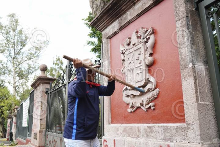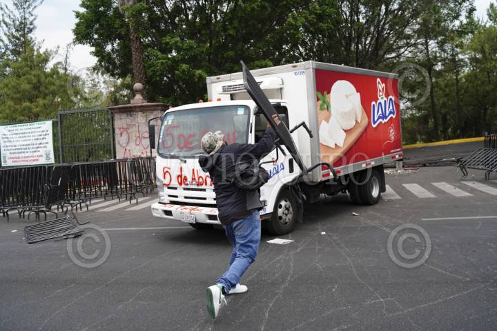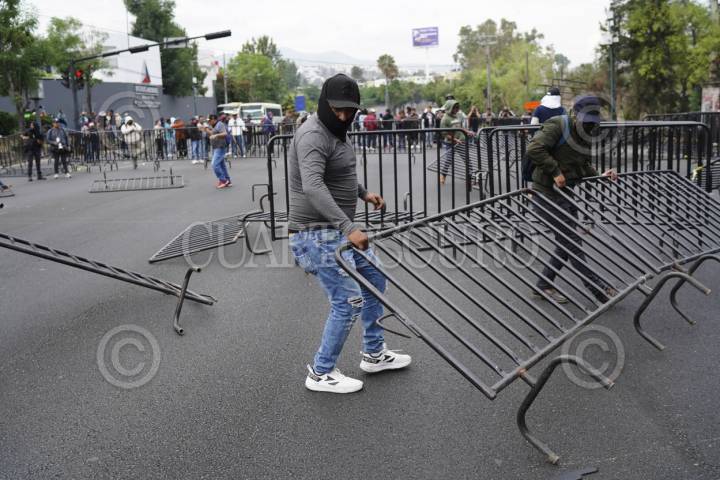 MORELIA, MICHOACÁN, 26MAYO2025. Al menos 100 habitantes de la comunidad de Arantepacua, municipio de Nahuatzen, se manifestaron esta mañana frente a las oficinas del gobierno estatal, conocidas como Casa Michoacán para exigir se cumpla con obras pendientes, principalmente la construcción de un hospital. Los inconformes llegaron a bordo de tres autobuses, algunos de ellos armados con palos y con el rostro cubierto. En tanto, elementos de la Secretaría de Seguridad Pública del estado, colocaron vallas frente al edificio gubernamental. Hubo momentos de forcejeos, pero finalmente optaron por el diálogo. En el lugar arribaron decenas de uniformados, mientras que los habitantes de Arantepacua, bloquearon el Libramiento frente a Casa Michoacán. FOTO: JUAN JOSÉ ESTRADA SERAFÍN/CUARTOSCURO.COM
